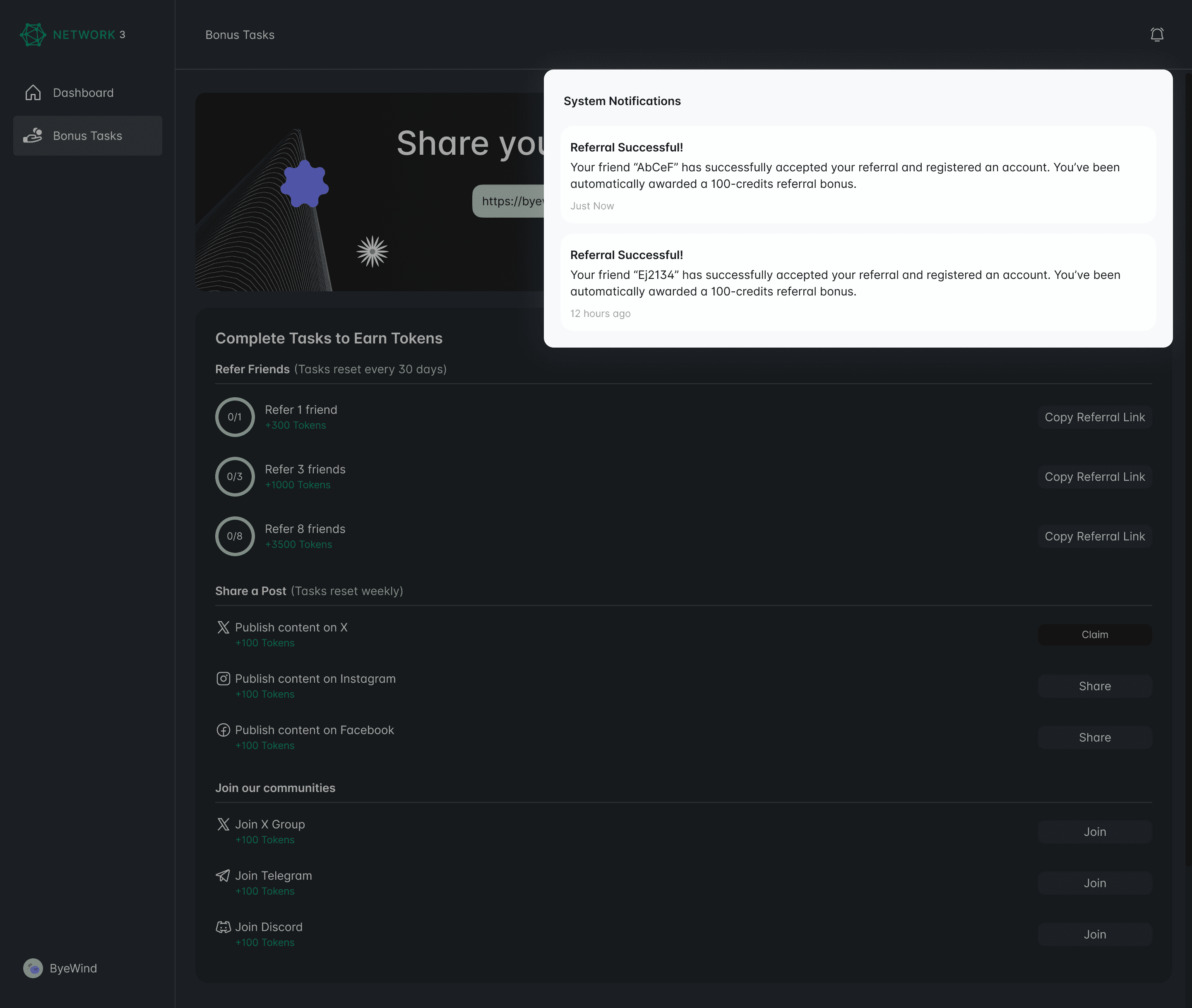The referral growth program helps users earn additional tokens by inviting others to join Network3. It makes sharing and tracking referrals simple, turning community building into a rewarding experience while expanding the platform’s reach.