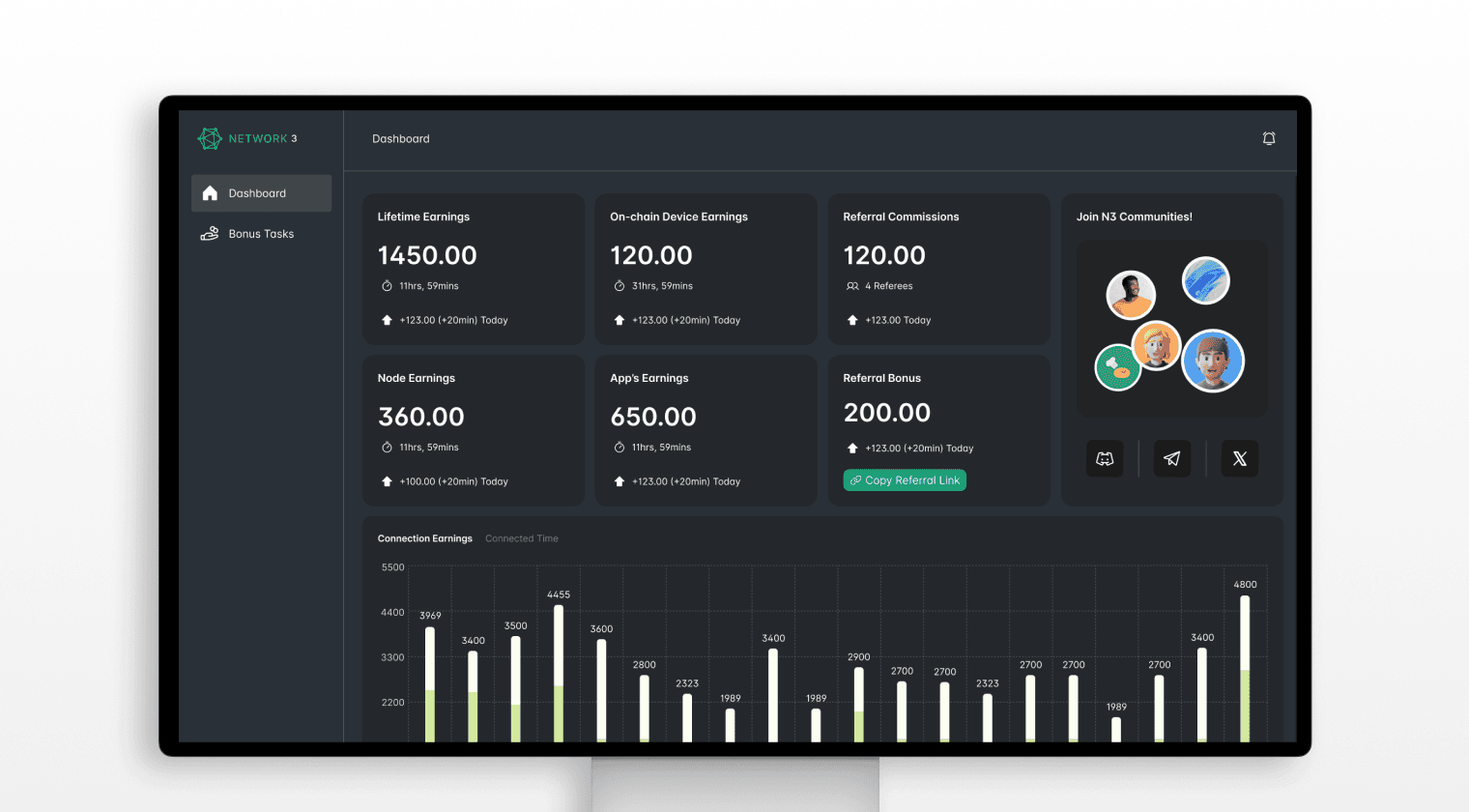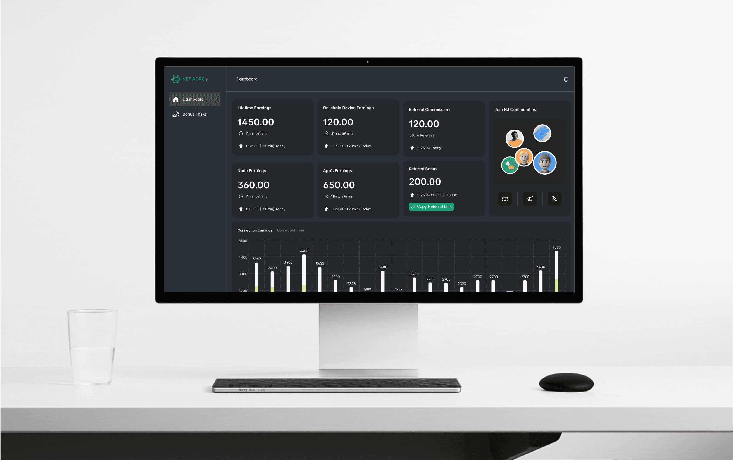 I designed the Data Visualization page to give users a clear, real-time view of their token earnings across connections and referrals. By surfacing key metrics and trends in an intuitive layout, users can confidently track earnings, find opportunities to earn more, and build consistent habits within Network3.