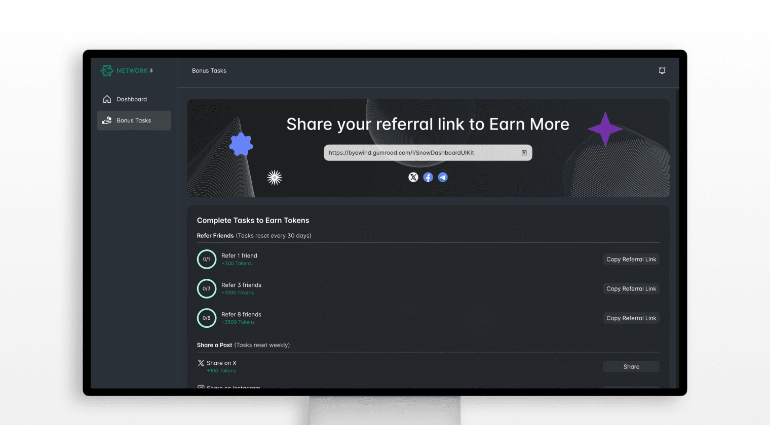 After monthly referrals, we added post sharing to keep users engaged and help Network3 grow. Users share, submit the link, verify, and earn rewards—simple and scalable.