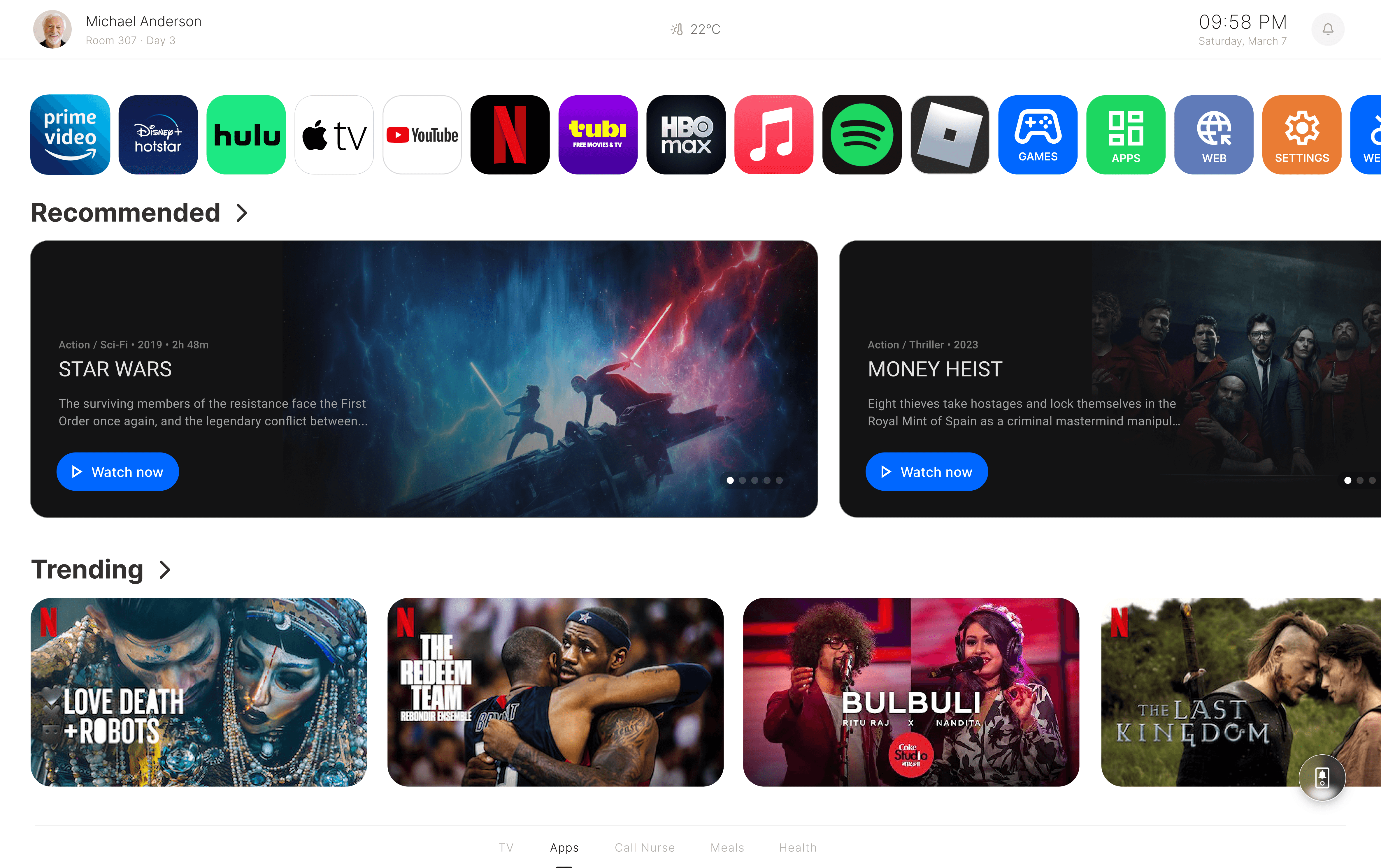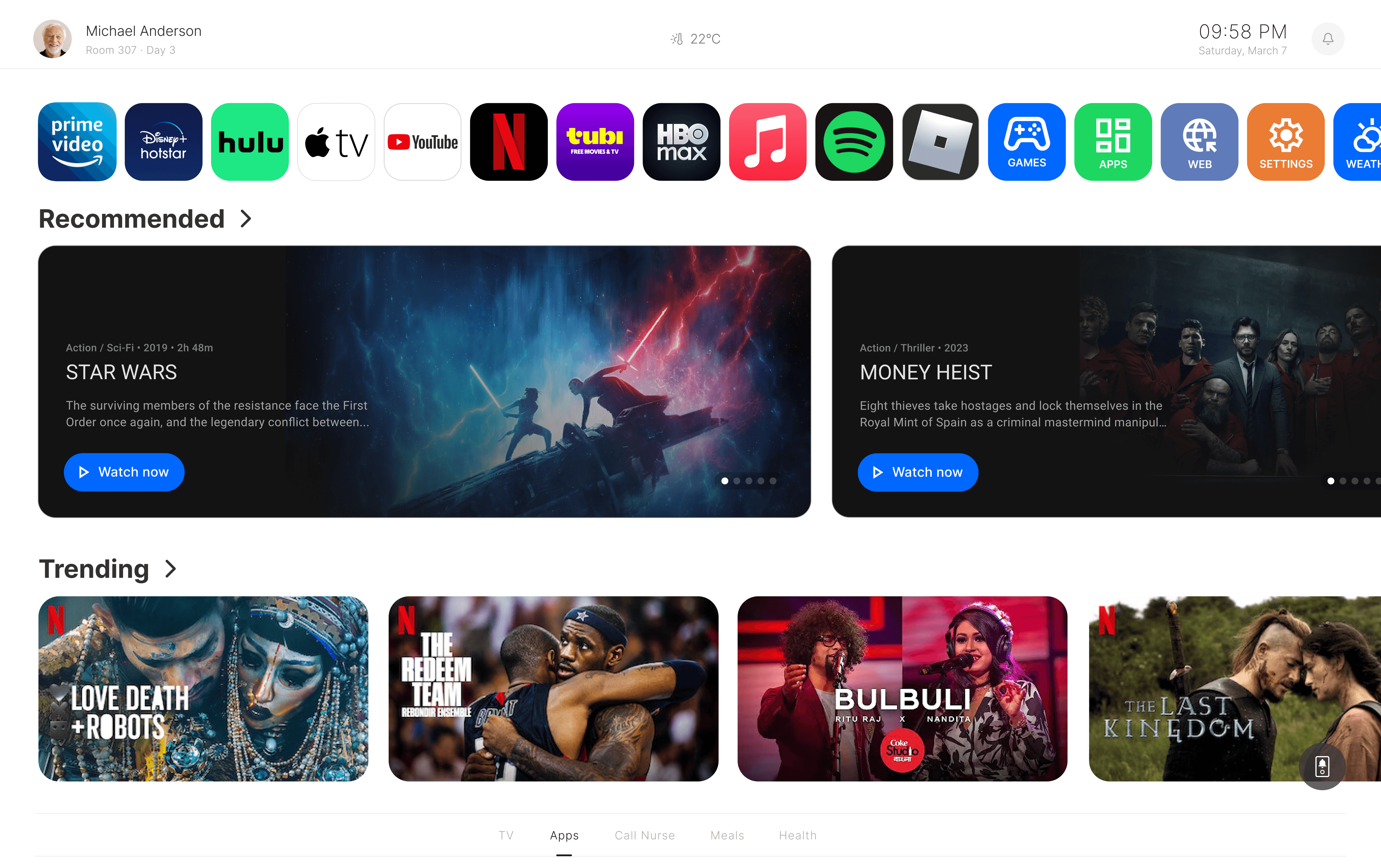 • Freelance product designer exploring a bedside TV platform that combines entertainment, hospital services, and patient interactions in one.